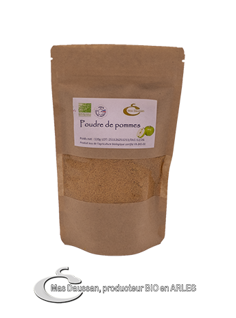 Co-produit issu de la production de nos jus de pommes. Les résidus de pressage (la partie sèche appelée la drêche) sont déshydratés et transformés en farine puis en poudre par nos soins.